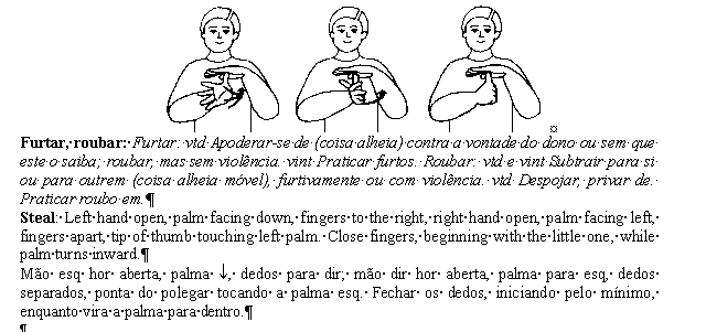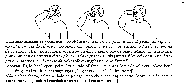 I'm sending you an excerpt page from our new Brazilian Sign Language Dictionary, namely three Brazilian signs that use a similar handshape and movement (BEAUTIFUL, AMAZON, STEAL). They have been converted in a hurry into three .GIF files, and the graphic quality of the images has suffered considerably in the process. I apologize for that. Even so, perhaps you may still identify the drawings. We would be obliged should you help us write these signs using SW. One of our difficulty is that all fingers move one by one (from little finger to thumb), and not simultaneously. The movement is the same, but each finger starts closing only after its predecessor has already closed some 30 degrees, in a sucession from little finger to thumb. In the sign STEAL, the result is similar to a spiral turning inward. The palm itseft begins open and ends closing in itself, as if it were a shell. There must be a similar movement in ASL, we are sure, but our deaf informant on ASL is not here right now. So I can't give you an equivalent ASL at the moment. Should you be so kind as to, at your earliest convenience, write them in SW this would allow us to be able to keep on working toward using SW for documenting the Brazilian Sign Language used in Sao Paulo. By the way, perhaps you will be glad to know that there is a growing consensus and productive cooperation among deaf people from different institutions in here. They're so excited about both the dictionary and SW that they've been "spreading the sign" (so to speak) about them. We're already with about 30 deaf co-workers and the revision process is going well. Thank God. Wonderful people! The dictionary is thriving and we already have 600 out of the final estimated 900 pages. The posting of further lessons on details on writing finger movements will be of great help. Last year, one of our most dear deaf coworkers, Sylvia Greenspan and I translated all the SW lessons from English to Portuguese. She has been using that material to teach her colleagues who are very curious about it. She taught classes on SW to the deaf kids at the EMEDA (a Sao Paulo City School for the Deaf), and is already teaching a full SW course to her kids this academic year (which has just started in Brazil). The dictionary will rovide the necessary thrust. Thank you. Fernando & lab crew at the University of Sao Paulo :-) | ||||||||||||||||||||||||