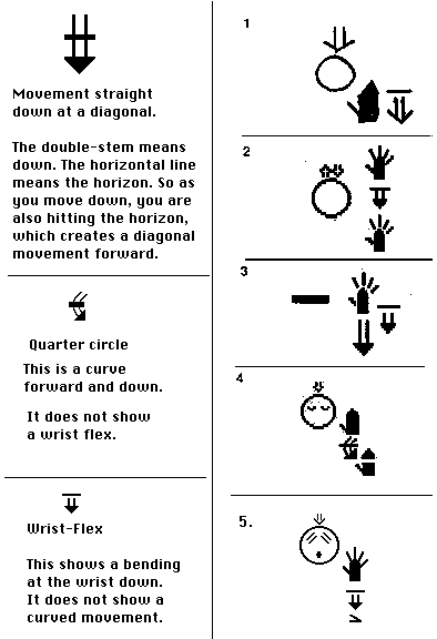June 29, 2000 Video Transcription Course ....regarding the 2nd sign on the video.... Joe wrote: (referring to Stefan's writing number 4 on the attached GIF) > I'm confused about Stefan's >> movement arrow; Stefan Woehrmann then responded: >Thank you for your comment on this! Valerie will probably comment this >solution as well. What was my idea ? >The right forarm is up, back of the hand facing you - (see gif "start ") >now the hand and (I think the arm as well in its endposition ) moves into a >vertikal positon (gif "end") Now - what kind of movement is it if you >concentrate on the fingertips - while the elbow keeps almost in place ? I >think its kind of quarter circle forward down ) >Therefor I decided to use this movement arrow ? Is it correct Vallerie ? Valerie is now answering (grin ;-) Look at the attached GIF. You will see that writing the flexing of the wrist (bending of the wrist) is a different symbol that writing a curved movement. Although the curved movement arrow shows the pattern of the fingers moving down in space, it actually is not accurate enough, because it does not show that the wrist is bending. So I think the information of the wrist-flex is more important. I know Stefan is very busy with the last week of school and like everyone, there are times when we cannot focus on courses - so I do not expect a response on this ;-) So I think we have analyzed the first two signs enough!! In a week or so, I will start looking at the third and fourth signs - Thanks so much, Joe, Wayne, Mark and Stefan, for your input. You know far more SignWriting than you let on! Val ;-) | |||||