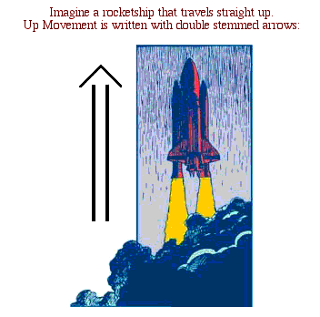 June 20, 2001 Lorraine - I am not sure what your questions are about movement arrows... Sometimes it helps to think of a rocket ship for up-down movement: | ||||||||