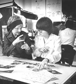 Publisher Valerie Sutton, left, was discussing the Newspaper layout