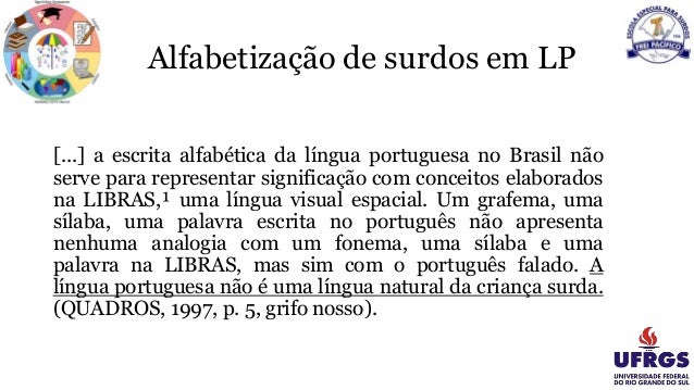12. Alfabetização de surdos em LP [...] a escrita alfabética da língua portuguesa no Brasil não serve para representar significação com conceitos elaborados na LIBRAS,¹ uma língua visual espacial. Um grafema, uma sílaba, uma palavra escrita no português não apresenta nenhuma analogia com um fonema, uma sílaba e uma palavra na LIBRAS, mas sim com o português falado. A língua portuguesa não é uma língua natural da criança surda. (QUADROS, 1997, p. 5, grifo nosso).