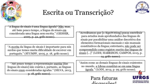 15. Escrita ou Transcrição? “A língua de sinais é uma língua ágrafa? Não, mas, até bem pouco tempo, a língua de sinais era considerada uma língua sem escrita.” (GESSER, 2009, p. 42, grifo nosso). “Acreditamos que [o SignWriting] possa contribuir para estudos mais aprofundados das línguas de sinais por possibilitar uma análise descritiva dos elementos formacionais manuais e não manuais constitutivos da língua; entretanto, não pode ser compreendido como registro escrito das línguas de sinais [...]” (LODI; HARRISON; CAMPOS, 2015, p. 14, grifo nosso). “Assim como as demais línguas de sinais existentes no mundo, a Libras constitui-se em uma língua ágrafa.” (LODI, 2014, p. 99, grifo nosso). “A escrita da língua de sinais é importante para nós surdos que temos muita dificuldade de escrever em português.” (STUMPF, 2005, p. 18, grifo nosso). “Até pouco tempo a representação escrita [das línguas de sinais] não existia e, portanto, as línguas de sinais eram consideradas ágrafas.” (SILVA, 2013, p. 18, grifo nosso). Para futuras