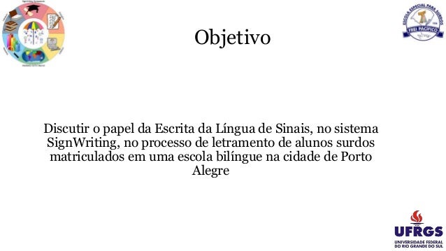 2. Objetivo Discutir o papel da Escrita da Língua de Sinais, no sistema SignWriting, no processo de letramento de alunos surdos matriculados em uma escola bilíngue na cidade de Porto Alegre