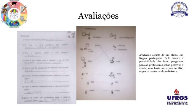 21. Avaliações Avaliação escrita de um aluno, em língua portuguesa. Não houve a possibilidade de fazer perguntas para as professoras sobre palavras e sinais; mas havia um apoio em SW, o que parece ter sido suficiente.