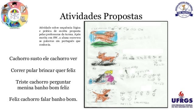 22. Atividades Propostas Atividade sobre sequência lógica e prática de escrita proposta pelas professoras da turma. Após escrita em SW, a aluna escreveu as palavras em português que conhecia. Cachorro susto ele cachorro ver Correr pular brincar quer feliz Triste cachorro perguntar menina banho bom feliz Feliz cachorro falar banho bom.