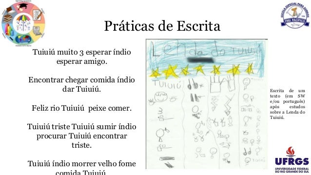 24. Práticas de Escrita Escrita de um texto (em SW e/ou português) após estudos sobre a Lenda do Tuiuiú. Tuiuiú muito 3 esperar índio esperar amigo. Encontrar chegar comida índio dar Tuiuiú. Feliz rio Tuiuiú peixe comer. Tuiuiú triste Tuiuiú sumir índio procurar Tuiuiú encontrar triste. Tuiuiú índio morrer velho fome