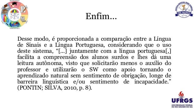 26. Enfim... Desse modo, é proporcionada a comparação entre a Língua de Sinais e a Língua Portuguesa, considerando que o uso deste sistema, “[...] juntamente com a língua portuguesa[,] facilita a compreensão dos alunos surdos e lhes dá uma leitura autônoma, visto que solicitarão menos o auxílio do professor e utilizarão o SW como apoio tornando o aprendizado natural sem sentimento de obrigação, longe de barreira linguística e/ou sentimento de incapacidade.” (PONTIN; SILVA, 2010, p. 8).