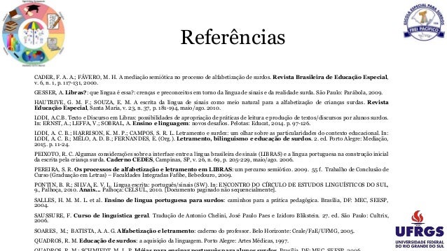 PEREIRA, S. R. Os processos de alfabetização e letramento em LIBRAS: um percurso semiótico. 2009. 55 f. Trabalho de Conclusão de Curso (Graduação em Letras) – Faculdades Integradas Fafibe, Bebedouro, 2009.