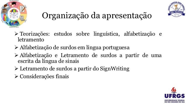 3. Organização da apresentação ? Teorizações: estudos sobre linguística, alfabetização e letramento ? Alfabetização de surdos em língua portuguesa ? Alfabetização e Letramento de surdos a partir de uma escrita da língua de sinais ? Letramento de surdos a partir do SignWriting ? Considerações finais
