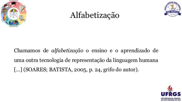 7. Alfabetização Chamamos de alfabetização o ensino e o aprendizado de uma outra tecnologia de representação da linguagem humana [...] (SOARES; BATISTA, 2005, p. 24, grifo do autor).