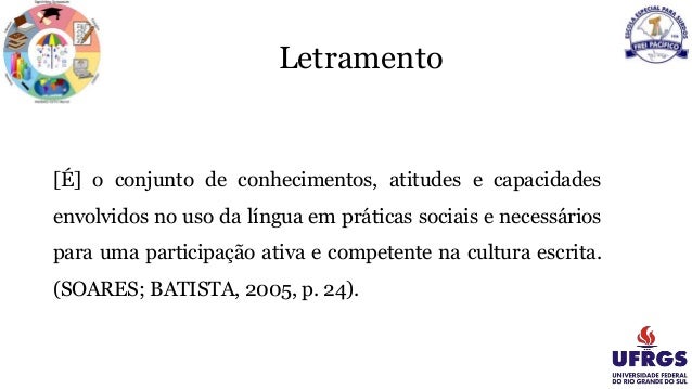 8. Letramento [É] o conjunto de conhecimentos, atitudes e capacidades envolvidos no uso da língua em práticas sociais e necessários para uma participação ativa e competente na cultura escrita. (SOARES; BATISTA, 2005, p. 24).